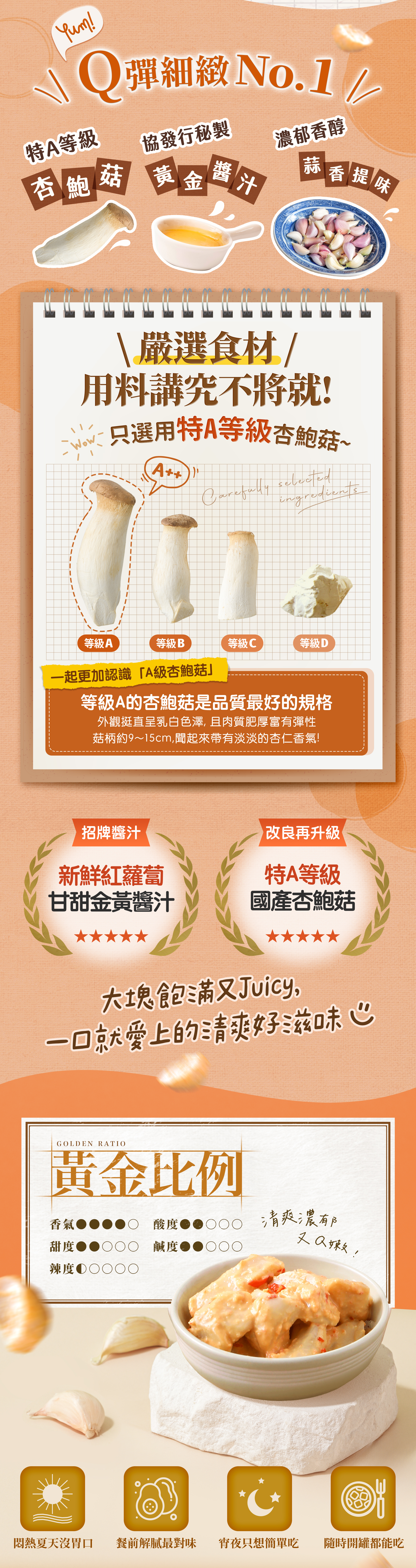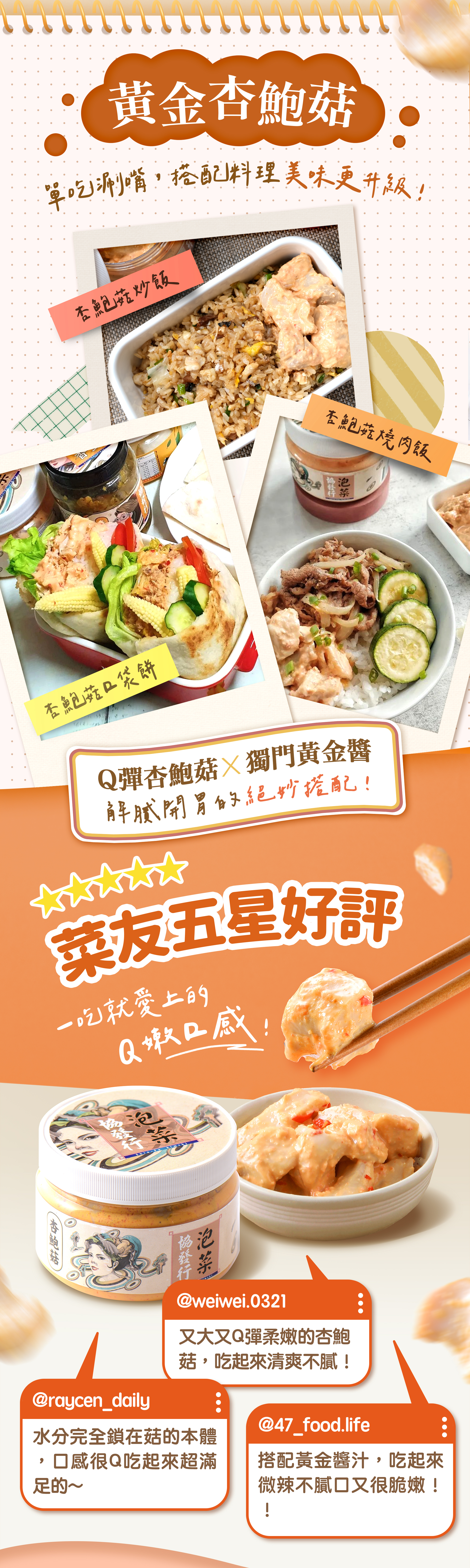 · 特選A級杏鮑菇,口感Q彈激似雞腿肉