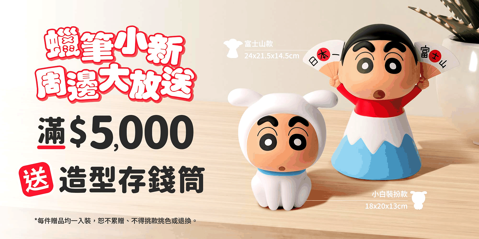 全店,★滿$𝟱,𝟎𝟎𝟎送【蠟筆小新造型存錢筒 (市價:$𝟏,𝟐𝟖𝟎元)】